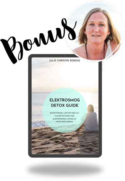 Julie Christine Boenig schenkt dir ihren Elektrosmog Detox Guide im Wert von 19.95 Euro. Sie teilt ihr komplettes Wissen mit dir, wie du unnötigen Elektrosmog in deinem Zuhause um bis zu 80 % reduzieren kannst - ohne in die Steinzeit zurück zu müssen.